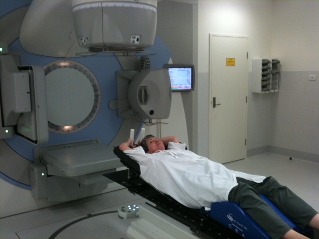 The whole treatment lasts only a few minutes, including the time taken to line up with the laser beams. There is no pain, no sensation at the time. Later on there are occasionally some ‘twinges’ of discomfort, not unlike those of ‘healing’ after the surgery. After the treatment the technicians return giving me the ‘all clear’ so that I can rest my arms and wait for them to lower the table. I sit up and step down from the table and change back into my street clothes before having my hospital bracelet removed and walking out the door.