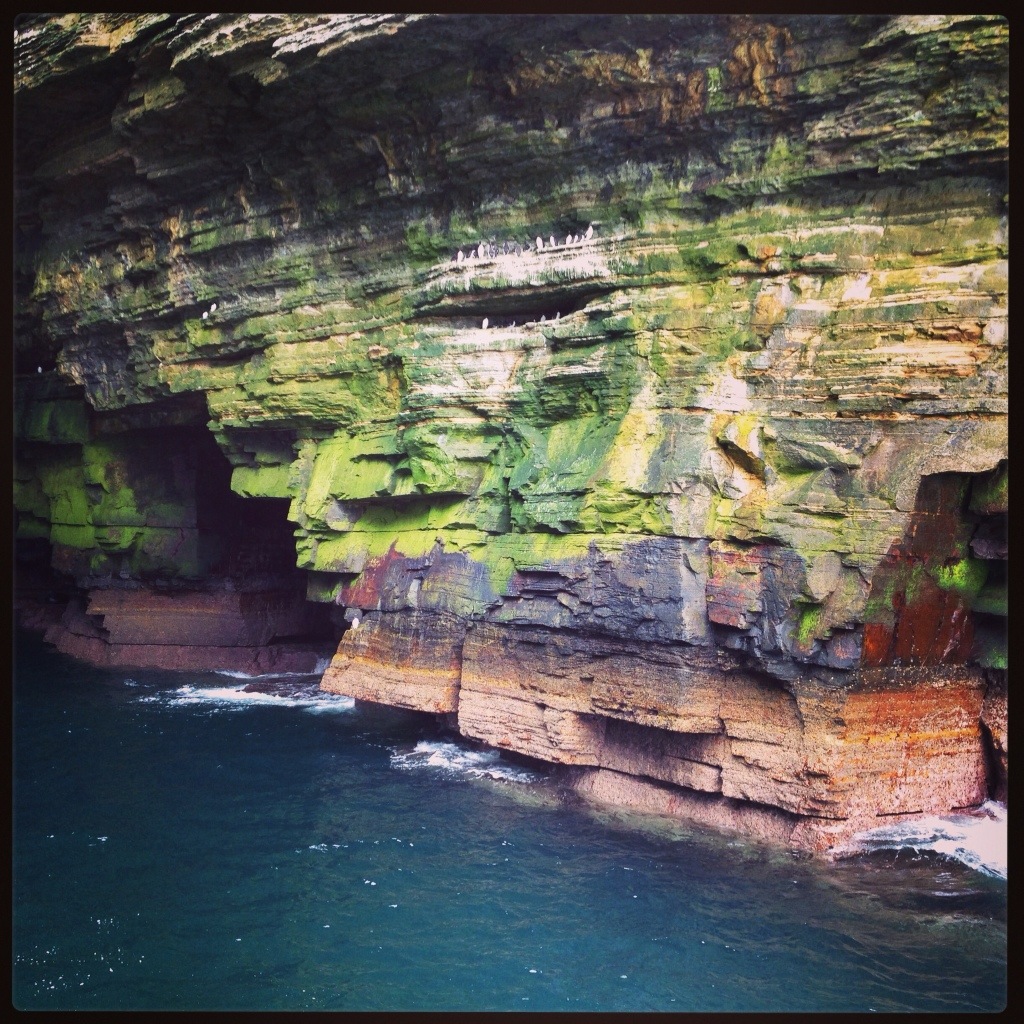 Hard act to follow, a story like that and a beautiful garden. But Mother Nature has her own stories to tell. We boarded the ferry only about 10 miles from Mey, at John o’ Groats, to visit the southernmost of the Orkney Islands. The weather here is so brutal, the Orkneys are not even accessible for much of the year. That we had a day it wasn’t raining, as well as one of the warmer days all summer was nearly miraculous! The main attraction was to see wildlife, and within minutes of approaching the island, we had already seen puffins, those funny little black and white birds with the orange clown feet and beaks. I have no photo for you as my camera is only my iPhone and one would need a huge lens and a lot of time and patience to get a photo of one. But it was exciting. We saw several bird species that nest on the sheer rock faces of the island, and quite a few grey seals as well, again at distances that didn’t permit good photos, but the scenery alone was worth the trip. If you have a good imagination you can see the seals in the photo of the caves.