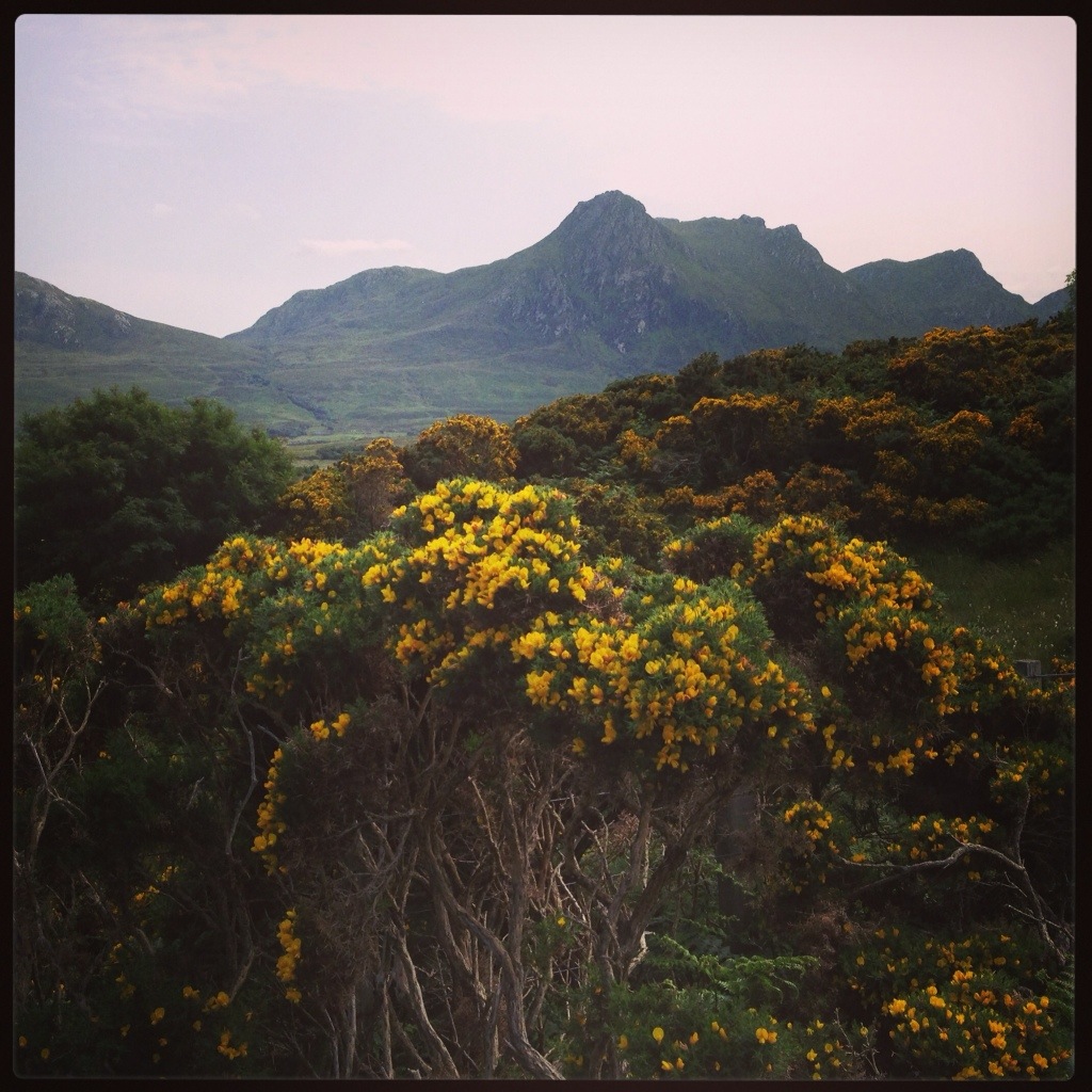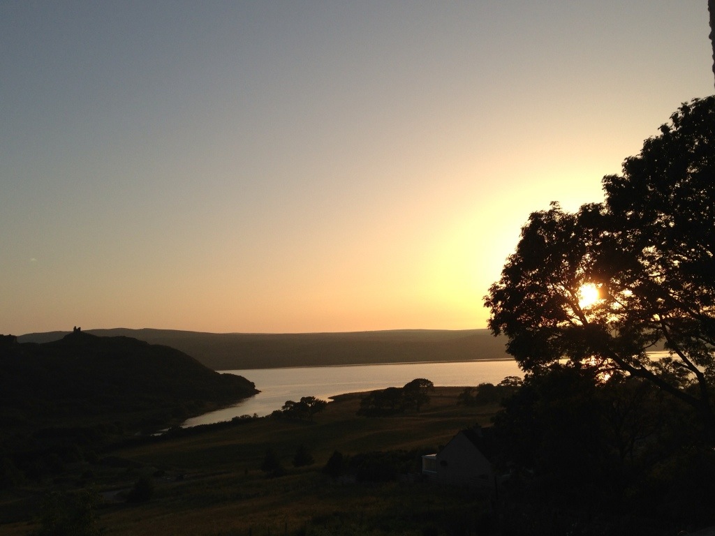 It is intriguing to be in a place where the sun doesn’t set until 10pm and it never quite goes completely dark then it is up again at 3.30 or so. The last two photos are the same view from our room at the Ben Loyal, one taken 9.30pm, the other about 12 hours later… The morning photo shows the fog sneaking around the mountain’s contours, and just about to cover the ruins of the castle that we hiked up to see.