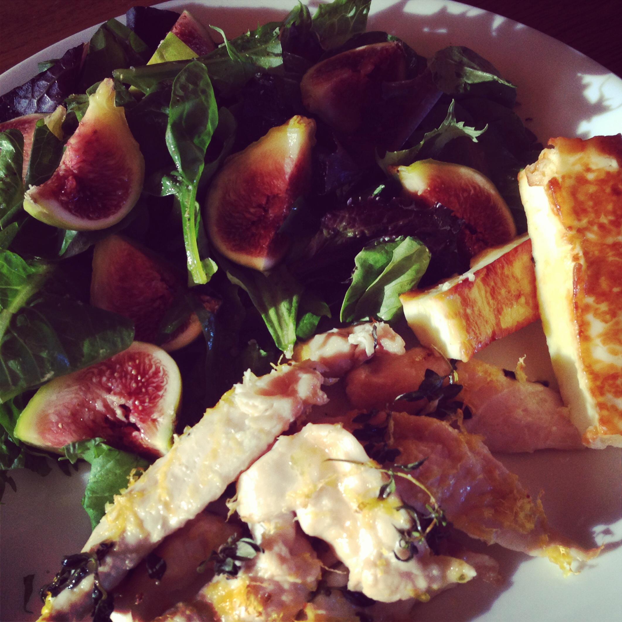 And then, to be truly decadent I made something I could never ordinarily make because Iโ€™ve never had enough fresh figs before.ย  I used a Donna Hay recipe for Chicken with Honey and Haloumi and green salad studded with fresh figs! Heaven.