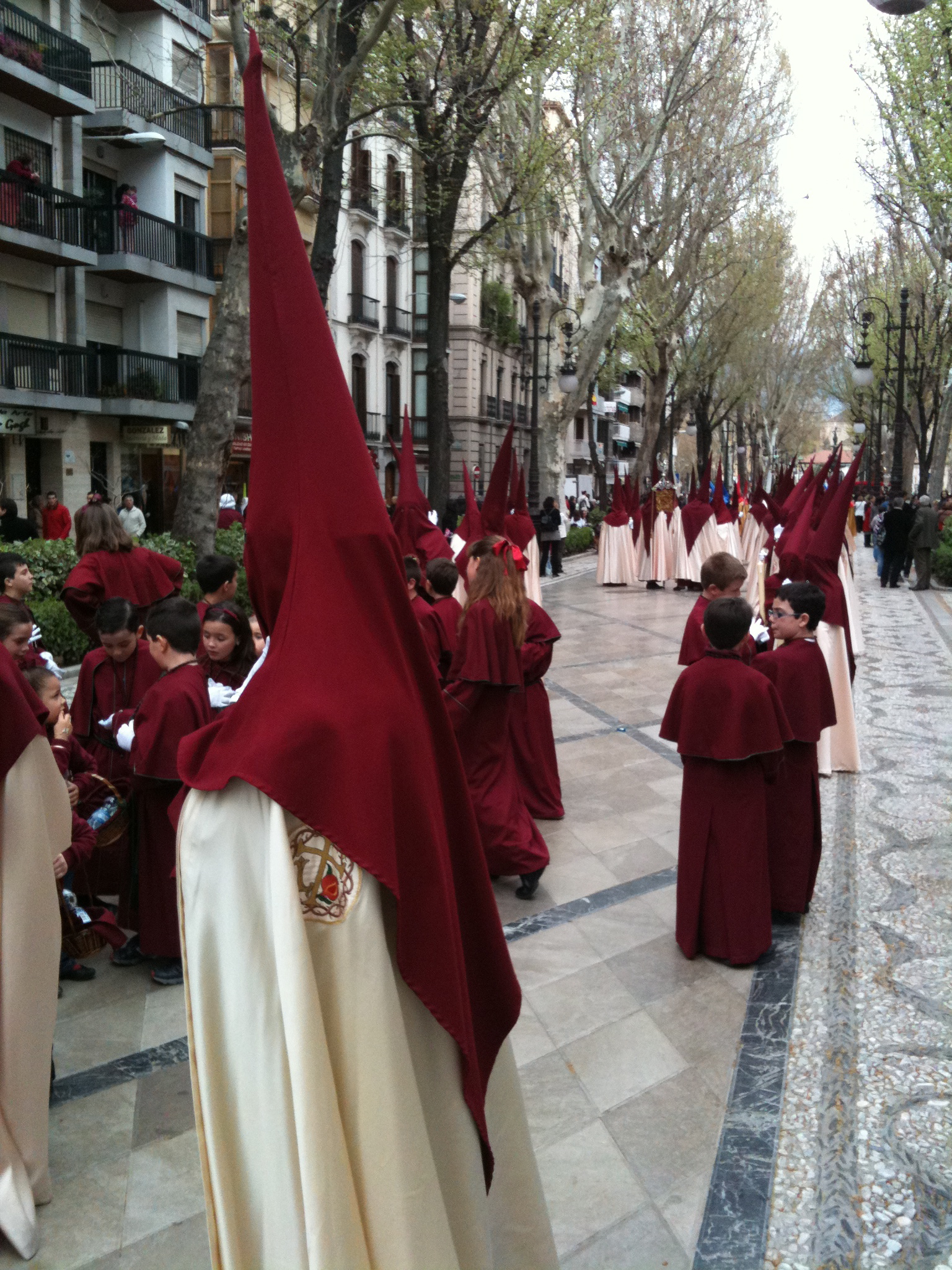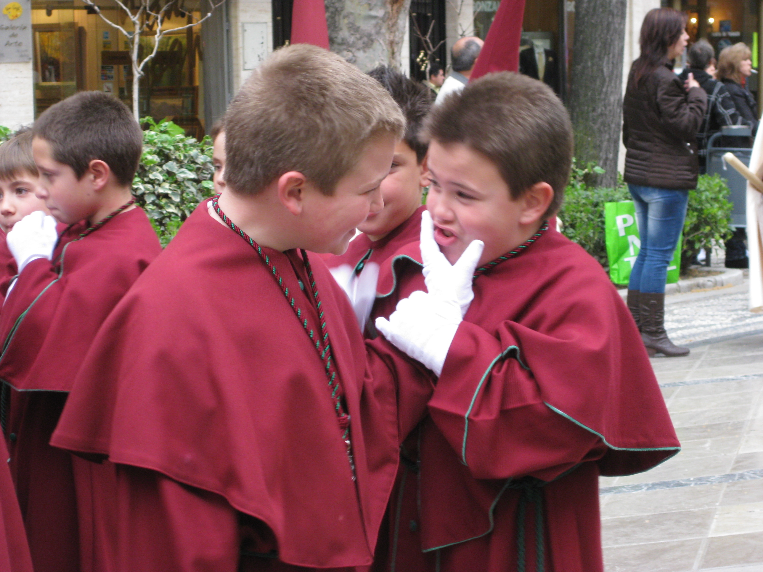 This may seem a strange photo to show when talking about ‘people’ as it almost seems devoid of them. However, if you look closely you will see dozens of feet showing at the bottom of the skirt of the “Pasos”, or float, carrying the statue. One of these floats is carried by each brotherhood in the city. It was Holy Week, the week preceding Easter, four years ago. I wish I could tell you how clever we were to plan to be there at that moment to see this stunning week of processions, but the truth is, it was an absolute fluke. The first evening we arrived at our hotel, we took a little walk before dinner and noticed something appeared to be about to happen in the pedestrian area of the city. In a short while hundreds had gathered and then in the distance we heard the somber music.