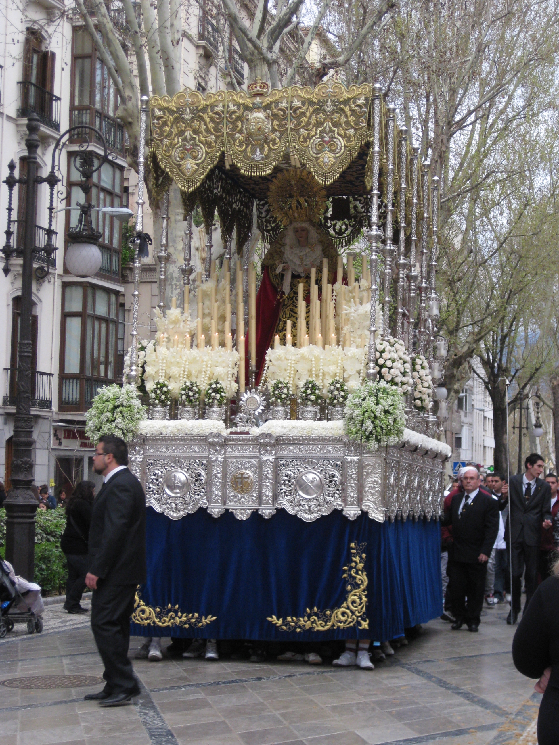 We have since learned that the people carrying the Pasos, practice for months ahead of the event. The weight is considerable and it takes great skill and strength to work in unison to move the heavy float from church to Cathedral. At some points the doorways are too low, so the penitents must kneel on pads and move forward to get the statue through.