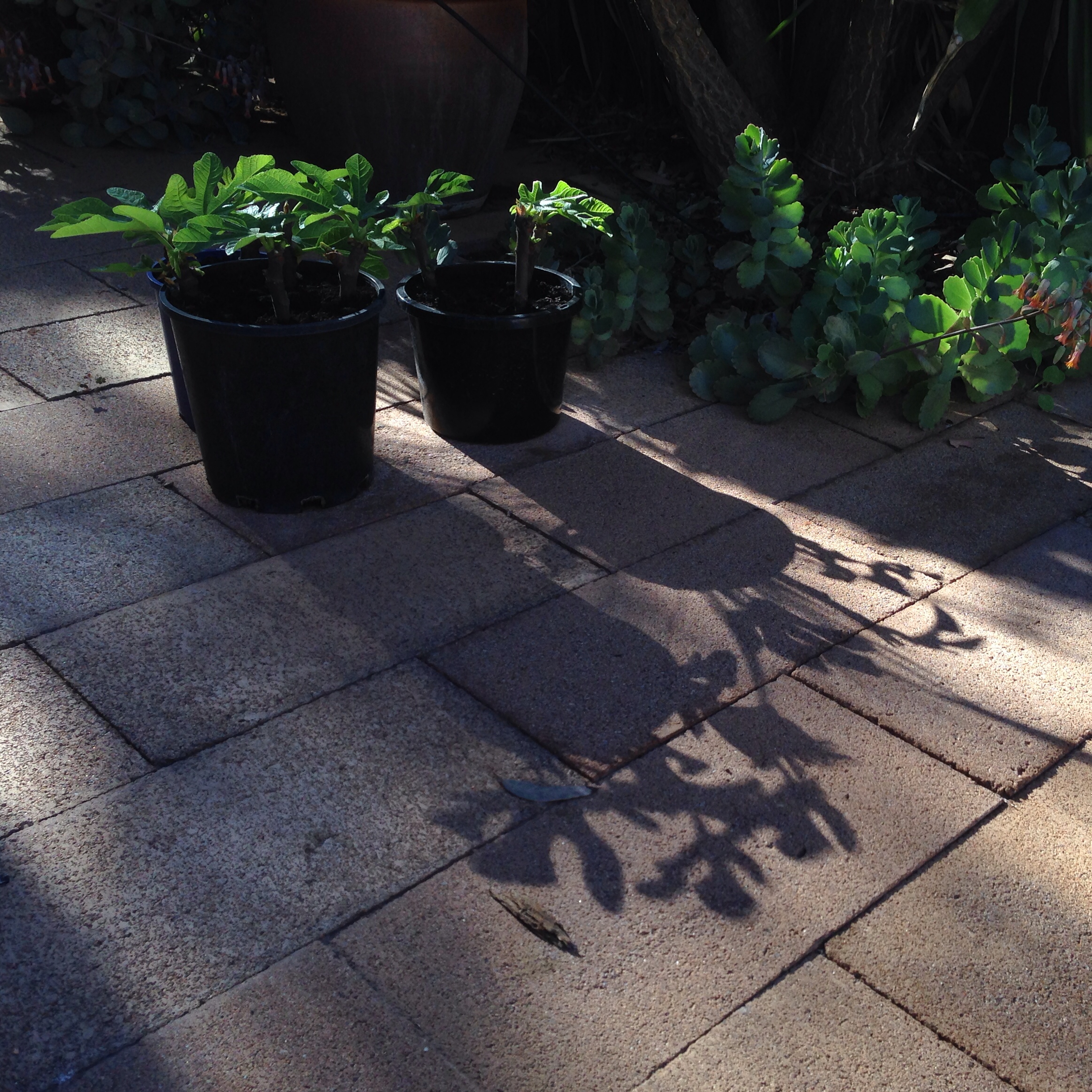 The fig babies have gone from the nursery to more spacious surroundings, so they can survive the harsh summer heat.ย Old friends have donned new green frocks,ย pretending they will play along!ย Be careful Fiona, there are four adolescents vying to take your place! (see 2013 Spring in Arid Country)
