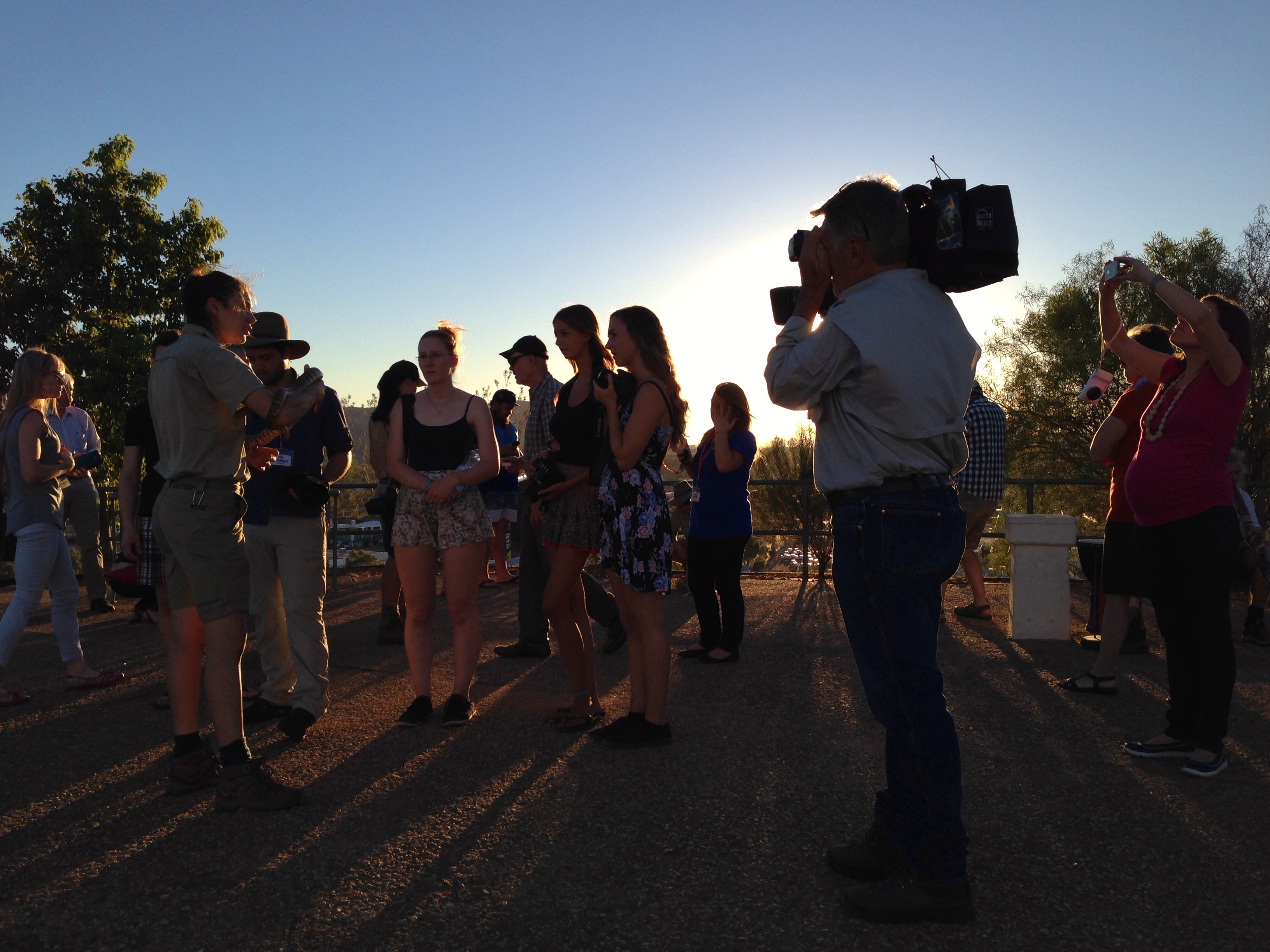 At 6pm atop Anzac Hill it was still very hot, 38C (100F) but I went along and found a bit of shade, and shook a few hands. Much to my surprise, some of the Instagram buddies, whose work I have enjoyed, were there and it was fun to meet them. Our hosts had provided local foods and some special guests from the local Desert Wildlife Park. In the background local performer, Andrew Langford, played the didgeridoo, which added to the very Central Australian feel of the event. People who happened along to view the sunset were intrigued, if not a little intimidated by the activities! There were even a couple of enterprising men with a drone! And then of course there were all those cameras! Who wouldn’t be a little intimidated? I’d guess about 20 or so photographers and contributors showed up, in addition to the Wildlife Park Rangers, the promotional people and other support staff. When will I learn these things are seldom as daunting as I imagine?