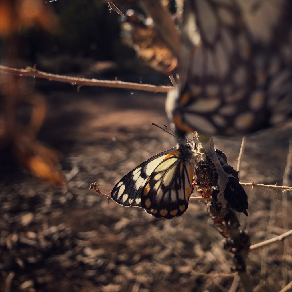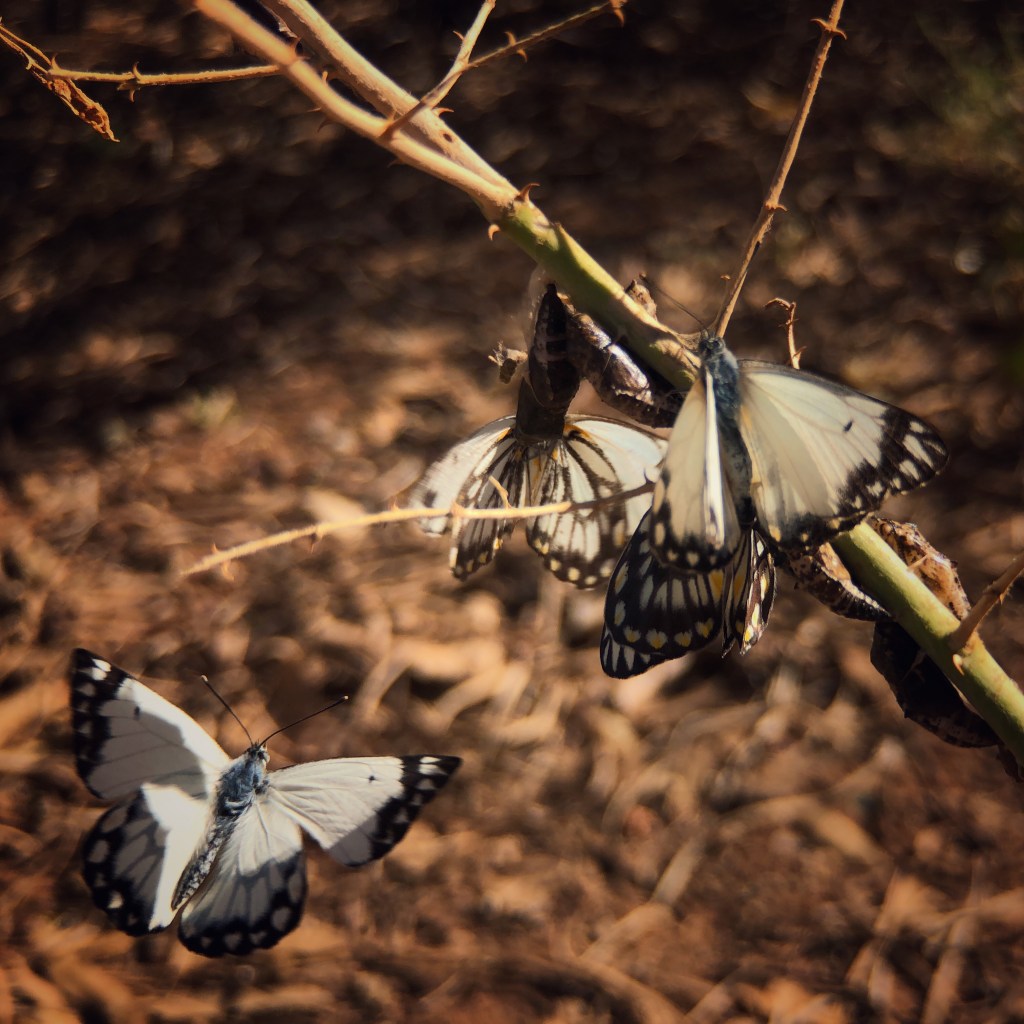 There just a few feet away was a white butterfly solidly clinging to a naked branch on a naked bush riddled with sharp thorns! I decided to see if the butterfly would sit still long enough for me to get a decent shot. Turned out, this Caper White butterfly wasn’t going anywhere. As I got closer I realised there were about 9 or 10 chrysalises lined up on the same branch, and it looked as if this was the first fully fledged butterfly to emerge. The transition from caterpillar to butterfly is really one of nature’s most amazing life cycles.