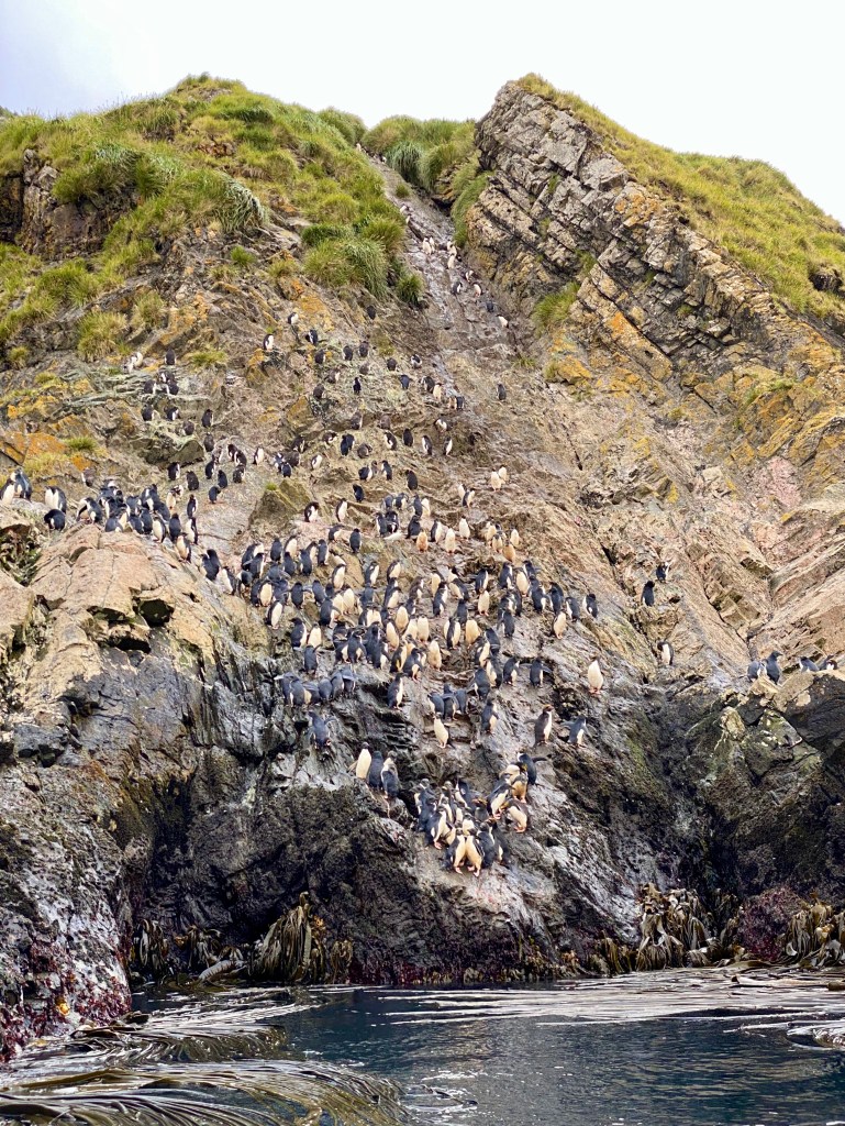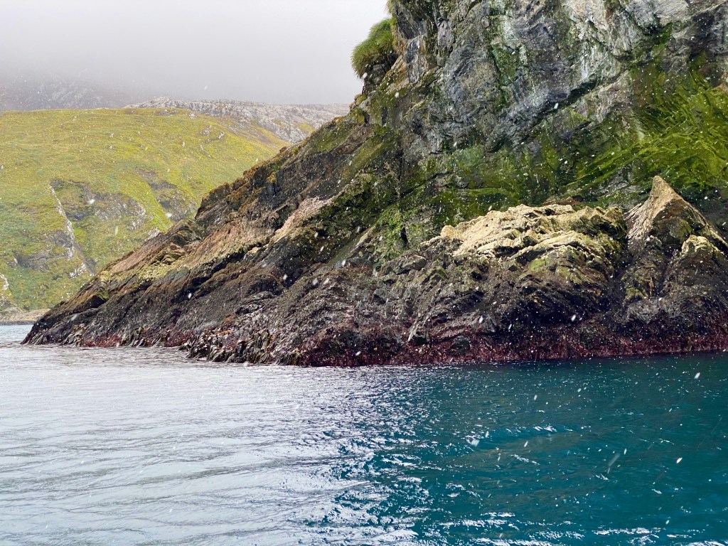 In this new, more protected bay, our group was to be first off the ship for an early morning excursion…7.30am. Ugh. And of course, we didn’t dare drink coffee or tea to wake us up, because…well…the no toilet issue. It was very blustery and cold and much of the excursion was in the shadows of the surrounding cliffs. At some point I remember vaguely seeing a zodiac head for the other ship, which also seemed a bit odd.