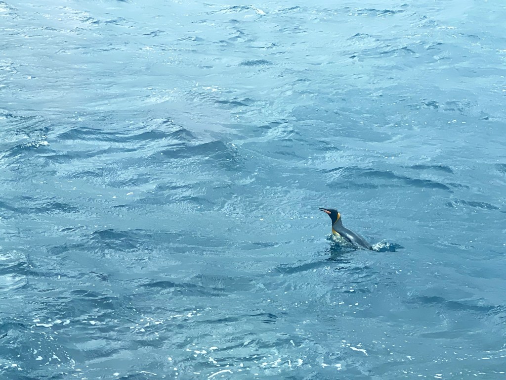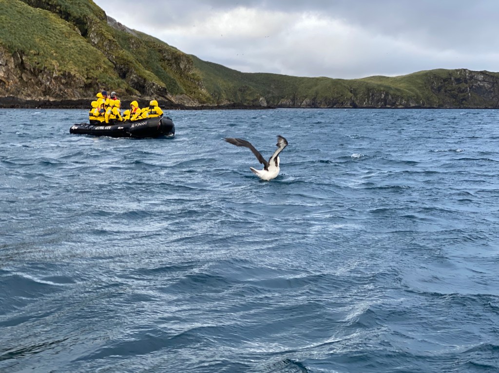 Our driver was calm and experienced, explaining this sort of thing happened occasionally. We, and a few other zodiacs, set off to find some albatrosses. They were also reasonably entertaining, their giant feet running and slapping the water as they took off and landed. Our Naturalist/Driver was a ‘bird guy’ and he was particularly excited to see Sooty Albatrosses, his favourites. But we were cold, and wet. My fingerless gloves had let me down badly at this stage, so I just removed them and shoved them into my pockets. By the end of another hour, you could hear the distinct lack of enthusiasm in everyone’s voices and perhaps a small edge of anxiety. Finally, we got the all clear that the ship had repositioned and it was now safe to board. Fortunately, having been the first to leave, we were also the first to return to the marina. Everyone was in agreement, it had been a challenging couple of hours. Not like Shackleton’s voyage, but nevertheless…tea, coffee and French pastries were needed!