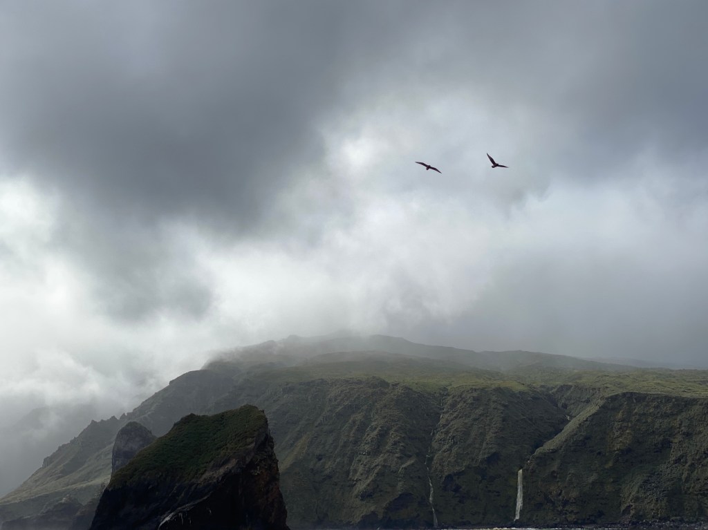 After the Captain’s tale of the Somali pirates, most of us would have followed him anywhere. So, when we approached the first of our supposed excursions around the Tristan da Cunha group (Gough Island) if he had said ‘Jump!’, to get into the zodiacs, we might have done it! However, the seas were rough and it was decided it was unsafe for our planned excursion, so we would have to view the island from the ship. The ship was manoeuvred as close as safety would allow and through the mists we could see it was a wild and not easily accessible place.