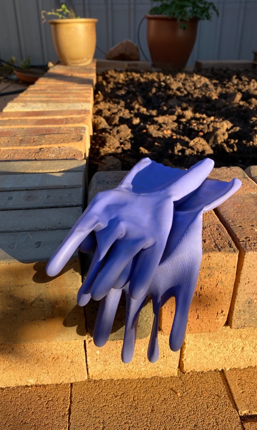 Purple gloves have been my gardening friends for years. They are sturdy and impervious and I know where my fingers are at all times. After months of serious hand washing and sanitising, the hands didn’t need any more wear and tear. Gradually the edge took shape. When I had finished, I had only ONE piece of a paver left. Every single other spare brick and paver had been used. No one was more amazed than me. In fact, I’m sure NO one will be amazed at all! When you look at the bed, it just looks like ‘oh, yeah, that looks normal.’ End of story. I hasten to add, I was not using cement to hold it all together, that would have been one skill too far for me, I think. But Scott had said he didn’t think I would need it, and so far it appears he was right.