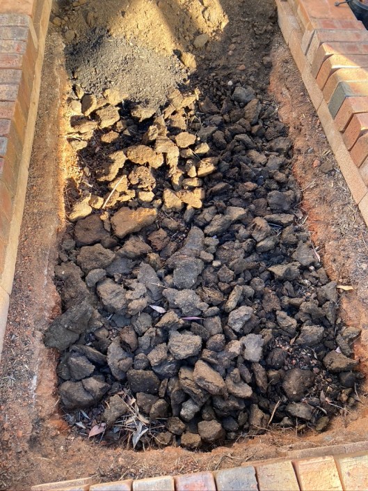First things first…transplant to a pot the poor little parsley plant that had survived the summer remaining almost the same size as when I planted it, six months previously. That done, in May I began digging out the 150mm of hard, packed old garden bed. It was just awful soil, full of rocks and very poor, compacted soil. What was I thinking? Knowing my 67 year old back is not used to hard labour, and that I also did not want to agitate fibromyalgia symptoms, I went about the project very slowly and carefully, digging with a pick and shovel a bucket of dirt at a time. I would carry the bucket of dirt to areas of the garden that just needed fill, but in which we didn’t want to grow anything. Engage abdominals, fill bucket, lift with my legs and lug the bucket of crappy soil from the courtyard to the receiving area. I could only do about six or eight buckets in one session. It was hard going.