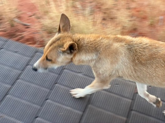 About twenty minutes before sunset we headed down along the boardwalk to the area where people brought their drinks and nibbles to watch the skies and mountains in the closing light of evening. I had been crouched over some wild flowers near the boardwalk and when I stood up to finish walking to the area under the desert oak tree, I was faced with a wild dingo staring down my husband!! Don was trying to ‘shoo’ the dingo in my direction but the dingo hesitated just long enough for me to get my iphone ready. Suddenly the dingo wheeled around and headed for me. I did get a bit of video but the more amazing photo is the one I almost blindly captured as the dingo trotted within inches of me on its way to wherever dingoes go! With the canyon walks and wildlife, it was a day we would remember for a long time.