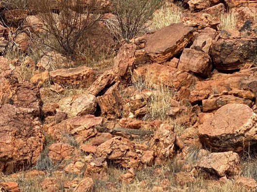 Later in the afternoon, Don and I decided to take a little walk around the grounds of the ‘resort’. As we left our room, Julie came running out from their room two doors up and called to her husband who had just driven in, “Jim, hurry, there’s a lizard trying to eat something!” We immediately wheeled around and headed toward their room too. Once on the balcony we looked into the rocks 8 or so metres away and there was a large Perentie, probably 6 feet long, dragging a rabbit down the rocks in preparation to dine al fresco. Jim was brave, approaching to about half the distance between us and the lizard and with his high quality lens got some amazing photos and video. This was a truly unusual thing to see.