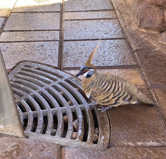 This time, as we approached, two Spinifex Pigeons came scurrying* out of the scrub and right up to us at the entrance. They raced over to the water fountains that were still dry as it was fairly early in the day. I got my iPhone ready and in position and then quickly pushed the button to allow some water down to the grate. It was like Pigeon magic, they scurried in, out and around like gleeful children in a public fountain in mid-summer.