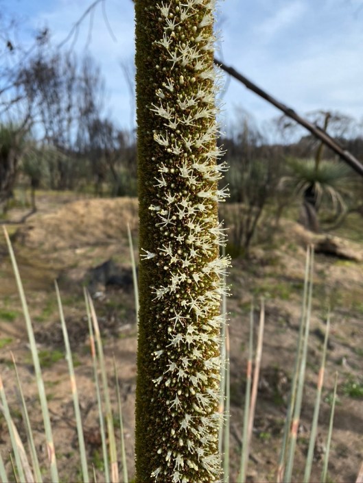 The sustainable timber industry had forests of trees that were 95% ruined for use, but a few that were already shooting new growth. Beside this forest were dozens of grass trees. We have never traveled anywhere in Australia where we have seen as many grass trees (Xanthorrhoea australis). Interestingly, where we saw the ones that had been through the fires, they had shot enormous flower spikes, an urgent will to survive! But in areas we traveled that had not had the fires, hardly a flower spike was seen. Mother nature at her best. In some areas there were dozens of grass trees, kilometres of them along the roads even. It was staggering. Grass trees are extremely slow growing but seemingly, rather fire tolerant.