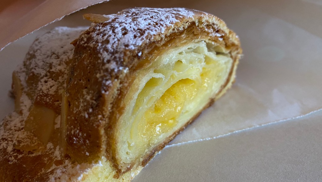 Later for morning tea I sliced a serving of what has become my most savoured treat. Almond croissant. Having refused previous offers made to purchase my favourite pastry, I deemed this morning the wait was over. During the winter Don had enlightened me about a piece he read stating that some expert or other had researched and reported tea is the perfect drink with pastry or cake…not coffee. Having tested this theory with a few willing sweet sacrifices, I concluded that for me at least, it seemed correct. But perhaps a bit more research was required. And so I added the perfect amount of organic tea leaves to a pot and waited while the kettle almost boiled so as not to make the tea bitter. I waited three minutes for the tea to steep and poured a cup to marry with my long awaited sweet.