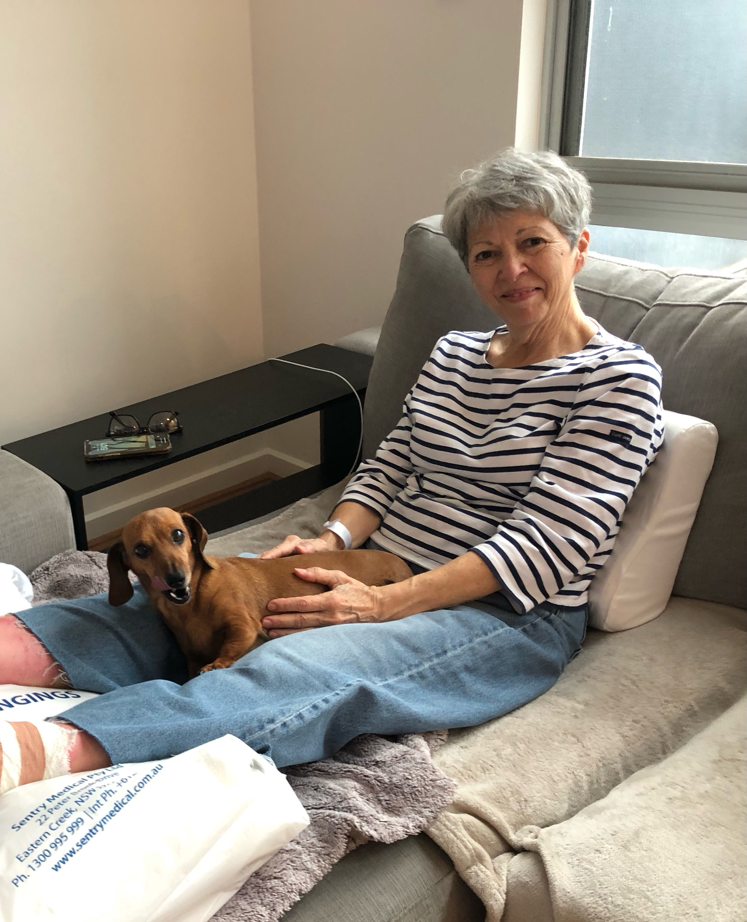 So. Here I sit, two days after surgery and 13 days until the sutures are removed and the bandages come off. Also 13 days before I can shower again! Gruesome, I know… waiting in my trendy, baggy, shaggy jeans… hoping that my feet will heal enough for our overseas trip starting June 14th. While convalescing at our daughter’s house, her tiny little sausage dog, Leni, provides endless comfort and entertainment. My dear husband is brushing up his skills of washing clothes and making cups of tea and lunch and doing a smashing job of it, but is clearly worn out. Meanwhile, we await an update for a newly developing situation with his health and it’s all a bit much. We just put one surgically repaired foot in front of the other and move forward. I will report more soon.