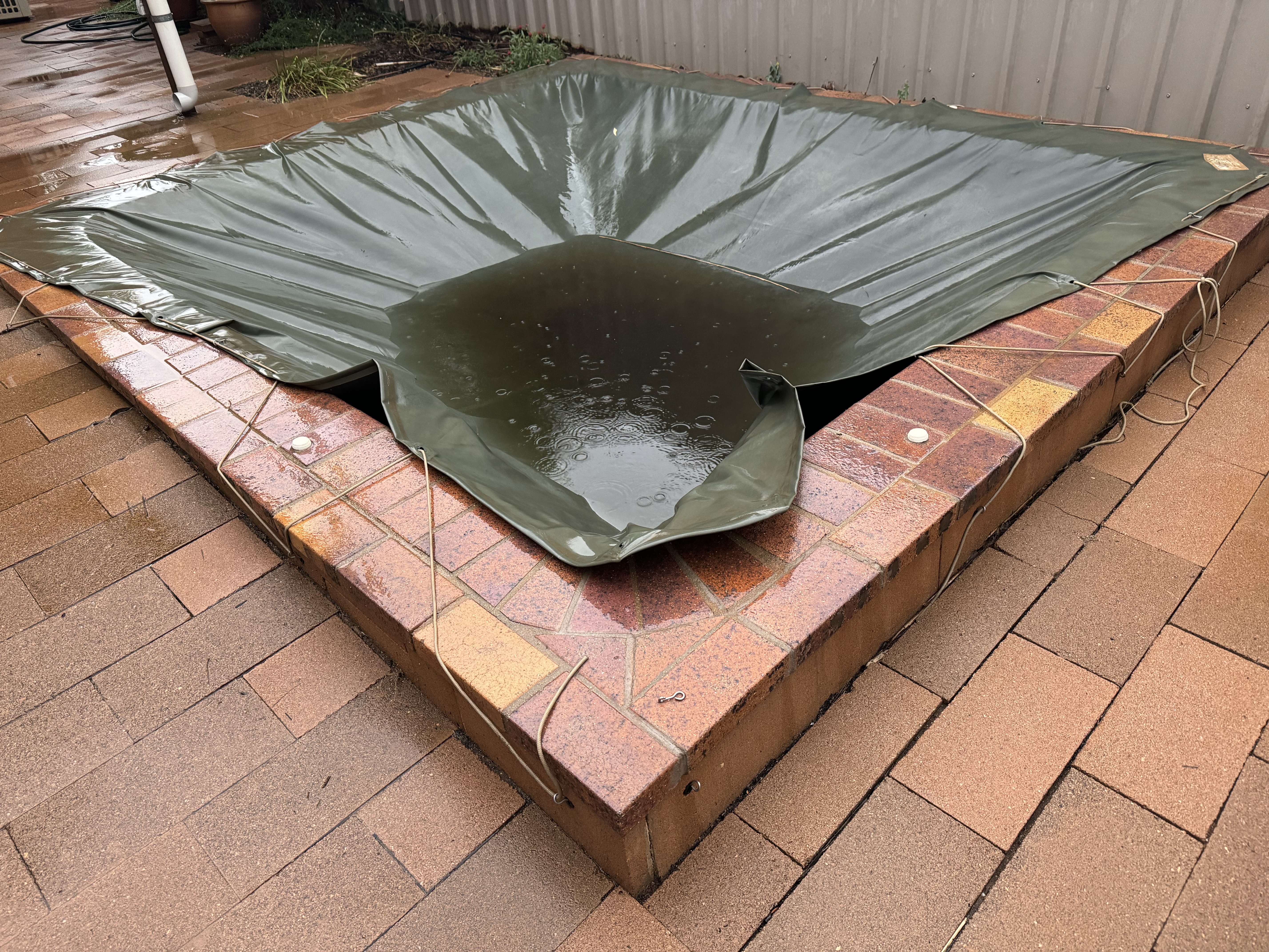 The next evening we had major rain (for us) which collected in the top of the spa and collapsed the cover in. This only happened because the geniuses that had been sent by insurance to do repairs, cut the rope and cover while using it to cut the fence pieces for repair. I hadn’t noticed it until days after they left, they just quietly left and never mentioned it. After we had been so careful for a year to keep the spa covered so the grout didn’t dry out and so the water didn’t turn green, my heart along with the spa cover collapsed. I had no idea what to do. The new pool guy I’d found had not responded to previous messages and this was no exception. So he is not an option, not in any lifetime I have left here on earth at least. What a nong. So rude. A very nice neighbour who insisted I call them if I needed anything while Don was away, came to the rescue.