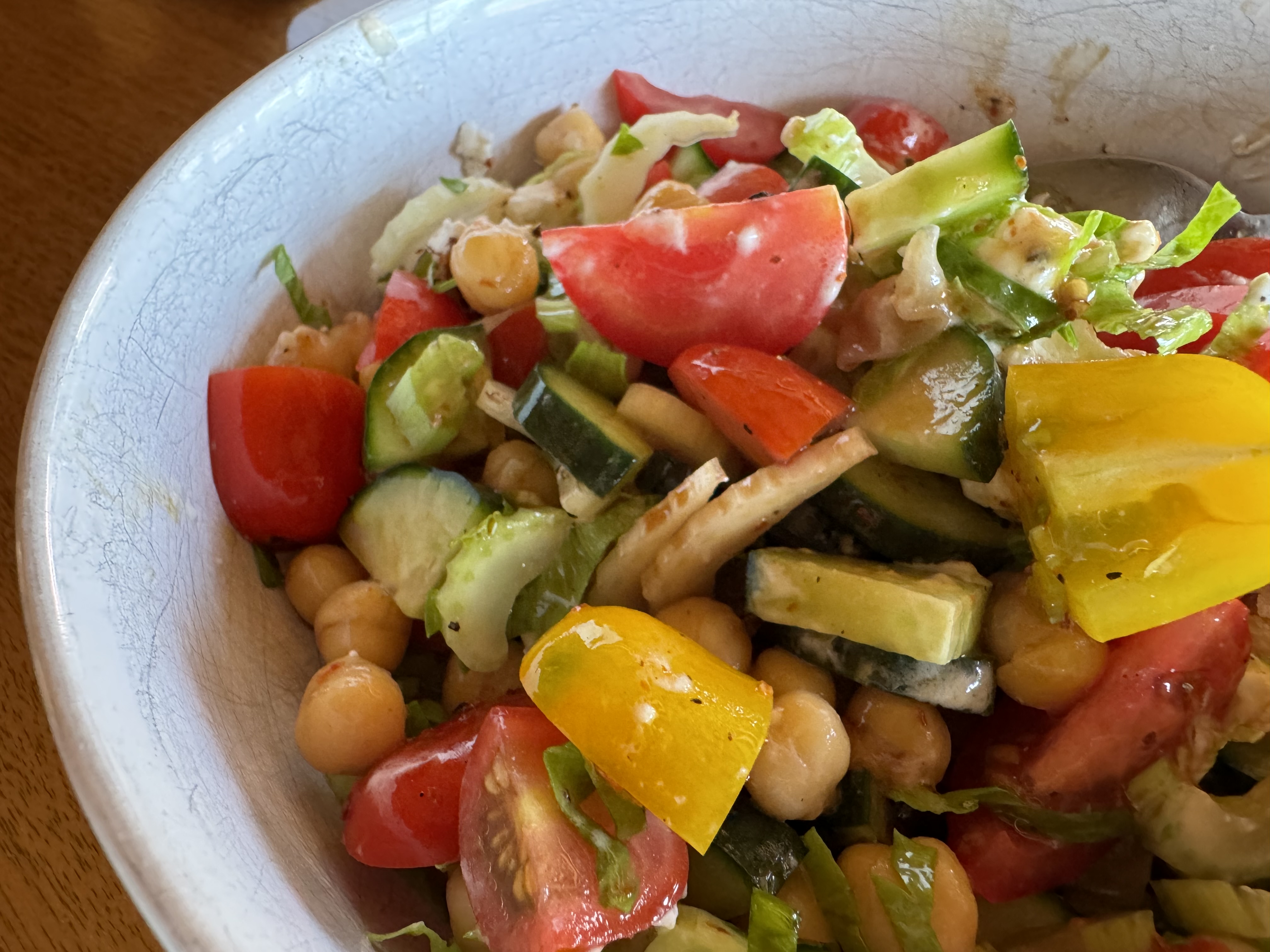 In the last couple of years Iโve developed a few strategies, particularly with regard to purchasing food items. When the main grocery doesnโt have what they usually have and I need it I go to IGA. We are seldom disappointed. They are now owned by an Indigenous group and mostly operated by Indians who do an excellent job. Another thing I do is always have an alternative menu, or one that is flexible. We have the luxury of doing that, not everyone does. Also I include a lot of pulses in our diet. Chickpeas, beans and lentils are inexpensive and I have several delicious recipes that donโt require exotic ingredients. Also I soak the dried versions of all of these and cook them myself, bagging in freezer bags so they are ready to use on short notice. Today I am having chickpeas with marinated goat cheese, cucumber, tomatoes, celery and fresh herbs for lunch. But sometimes I make soups or curry.