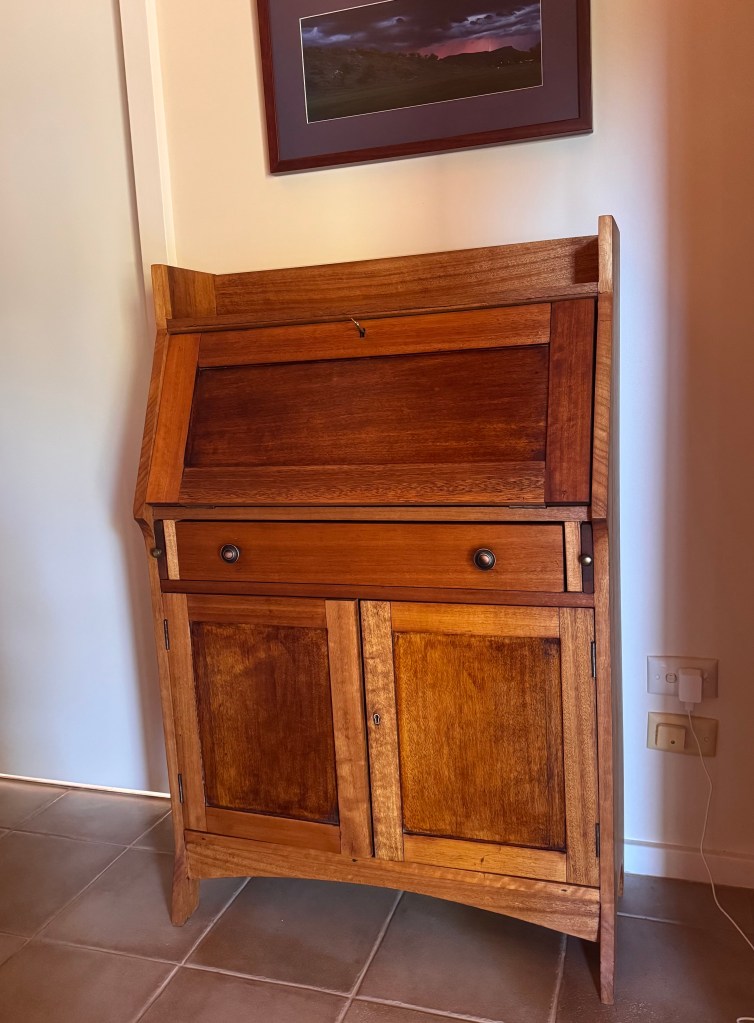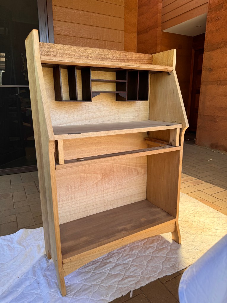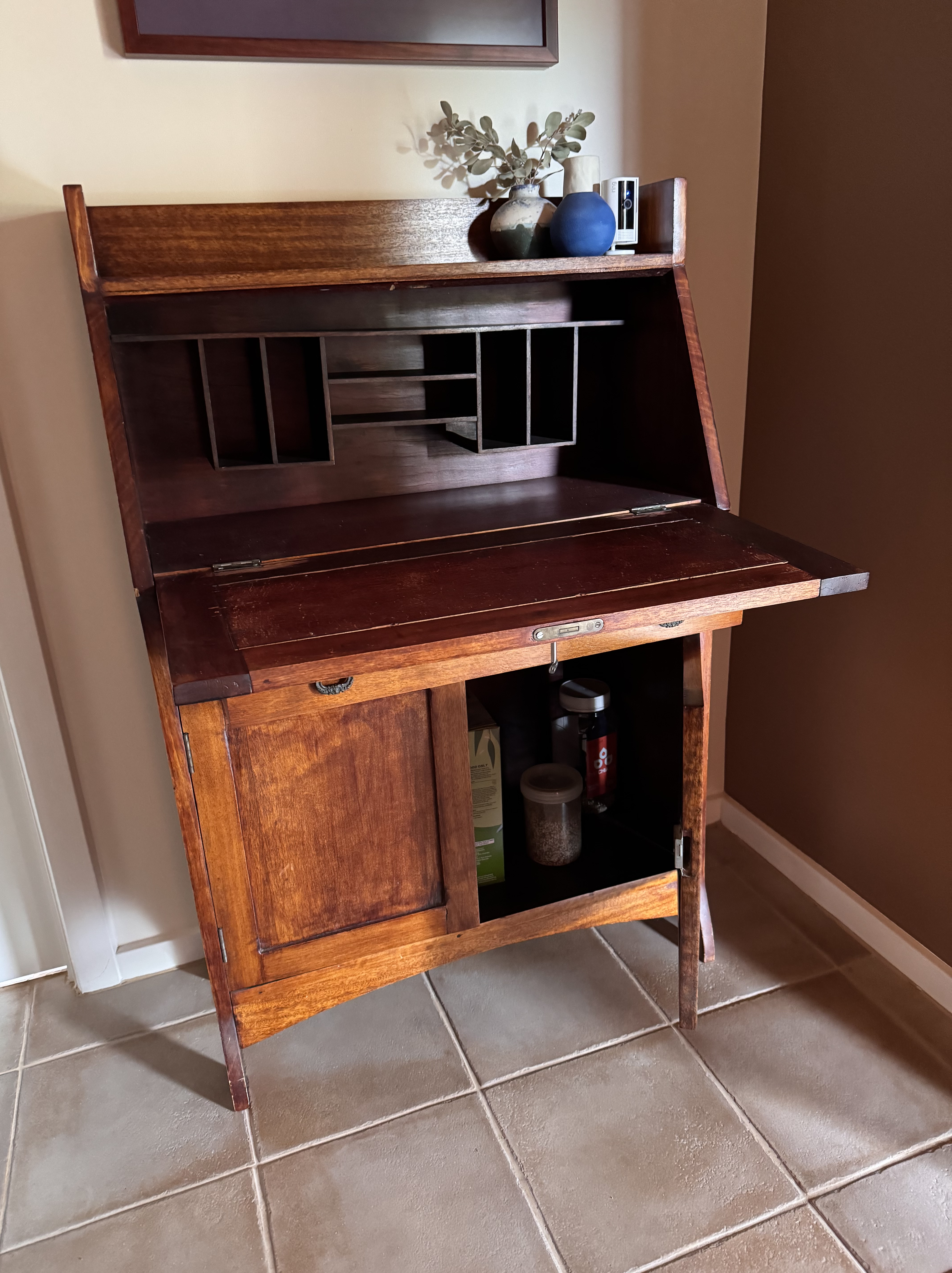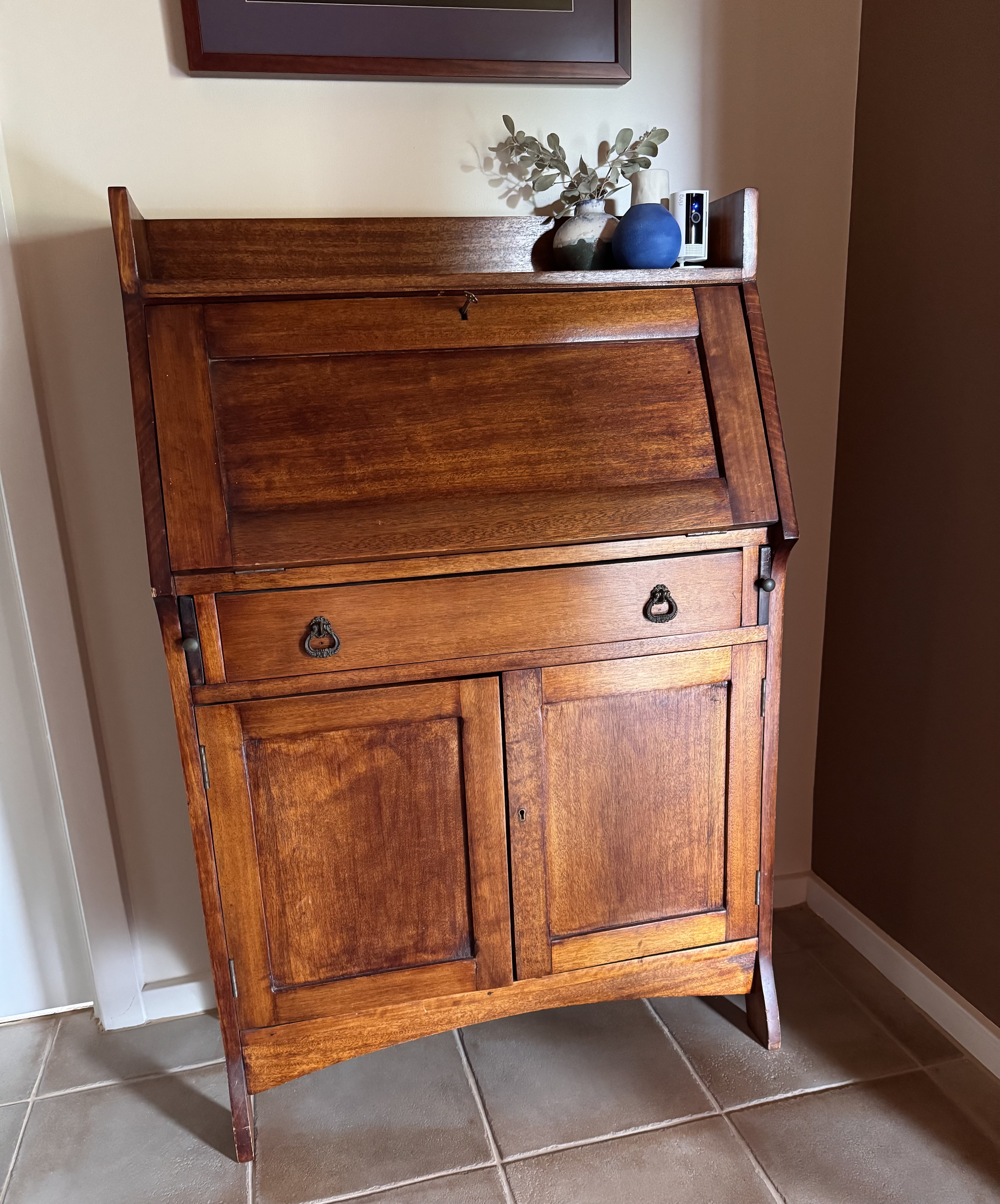 Our real estate agent called by to let us know he would be away until late January and to see if we needed anything. Nice young man about our daughterโs age. As he was leaving he commented on the desk and we said we were about to paint it. He gave us a side-eye look and said โMy Mum had an antique that she painted and she wishes she hadnโt. Donโt paint itโ It was enough to cause us to rethink the plan. The desk is–or at least part of it–antique. But it had been stained and re-stained and repaired numerous times in its life. The changes spoke of an era in the early 1900โs when that is what people did with their furniture. It also reflected the more recent changes made when someone wants to upsell something. I always knew it wasnโt a high quality antique but it fitted into the rustic nature of our rammed earth house and the little desk was exceedingly practical and of a size easy to accommodate.