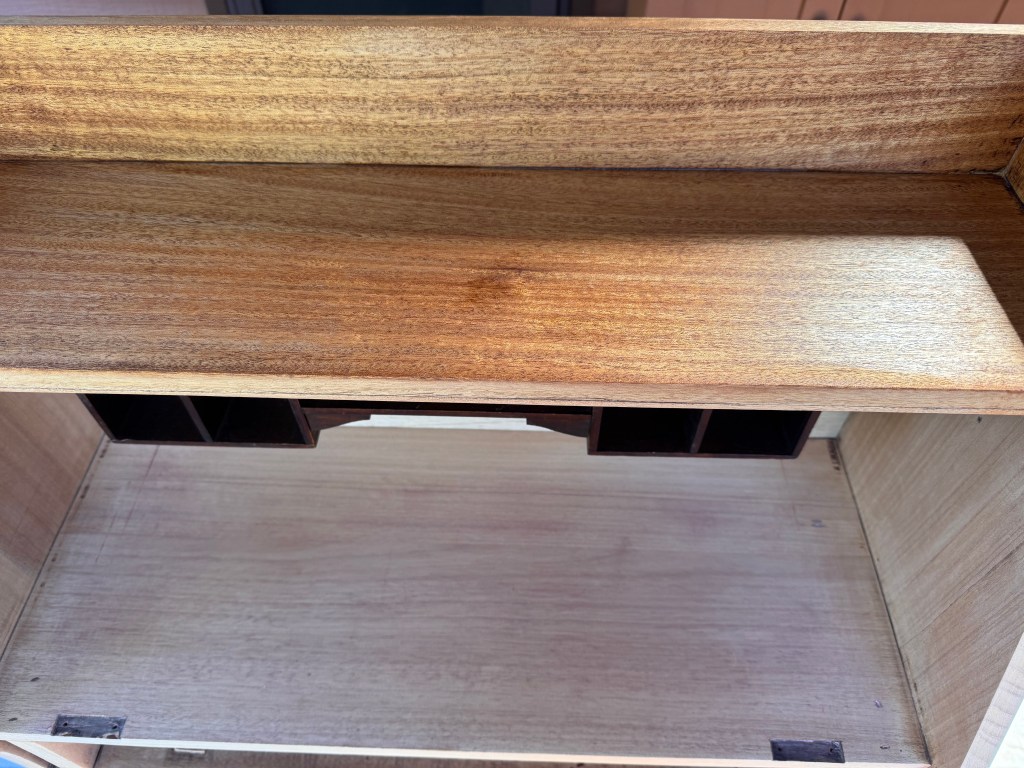The beeswax darkened the timbers much more than we expected. Though it was a milky white liquid the wood sucked it in and darkened. Itโs not the transition I had envisioned but isnโt that also the way of life? Things seldom turn out exactly as we dreamed. Is the finish perfect? Hell no. Did we make mistakes? Hell yes. I didn’t get my more updated, modern look. The refinished desk looked very much like the old one on the outside, but inside it did look much better. The thing I appreciate the most is that all the transitions and repairs over the 80 or more years of the piece are now on display for all to see. And who knows what effect the light and surroundings of the new apartment will create?