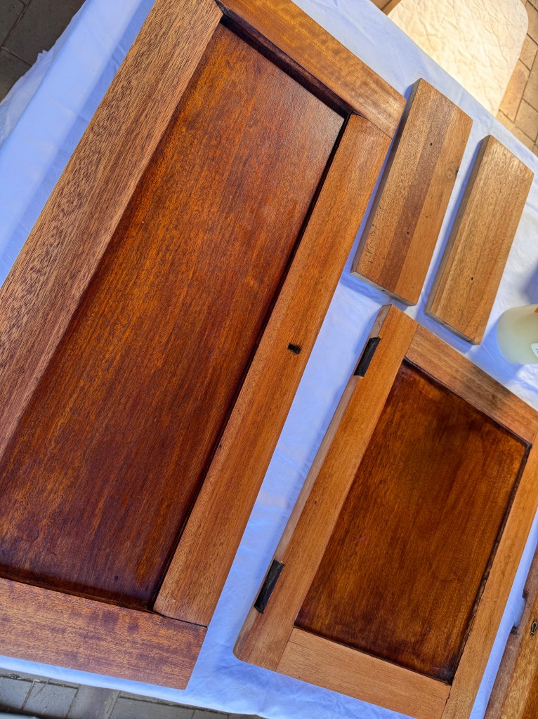 The loan from a friend of his orbital sanderโฆnow we were cookingโฆer sanding. And we were having the MOST interesting exchange of ideas as the project progressed. I was helping Don when his eyes just werenโt quite able to see details, he was helping me with strength related tasks and doing most of the hard sanding while I was chasing up other details and doing the final fine sanding. We both contributed ideas in the process as we โfeltโ what the piece needed. We decided to leave most of it showing the raw timberโฆthe history of the piece. There are at least three different types of wood, several different stain levels, some of which we could strip and sand away and some which we had to leave as a statement of the evolution of the life of the desk. Once the prep was done and we had to decide on a finish for the timber I watched more videos. It seemed like a clear spray acrylic in a satin finish might be good. We purchased a can and I sampled it on the backs of the doors. The smell was unbearable.