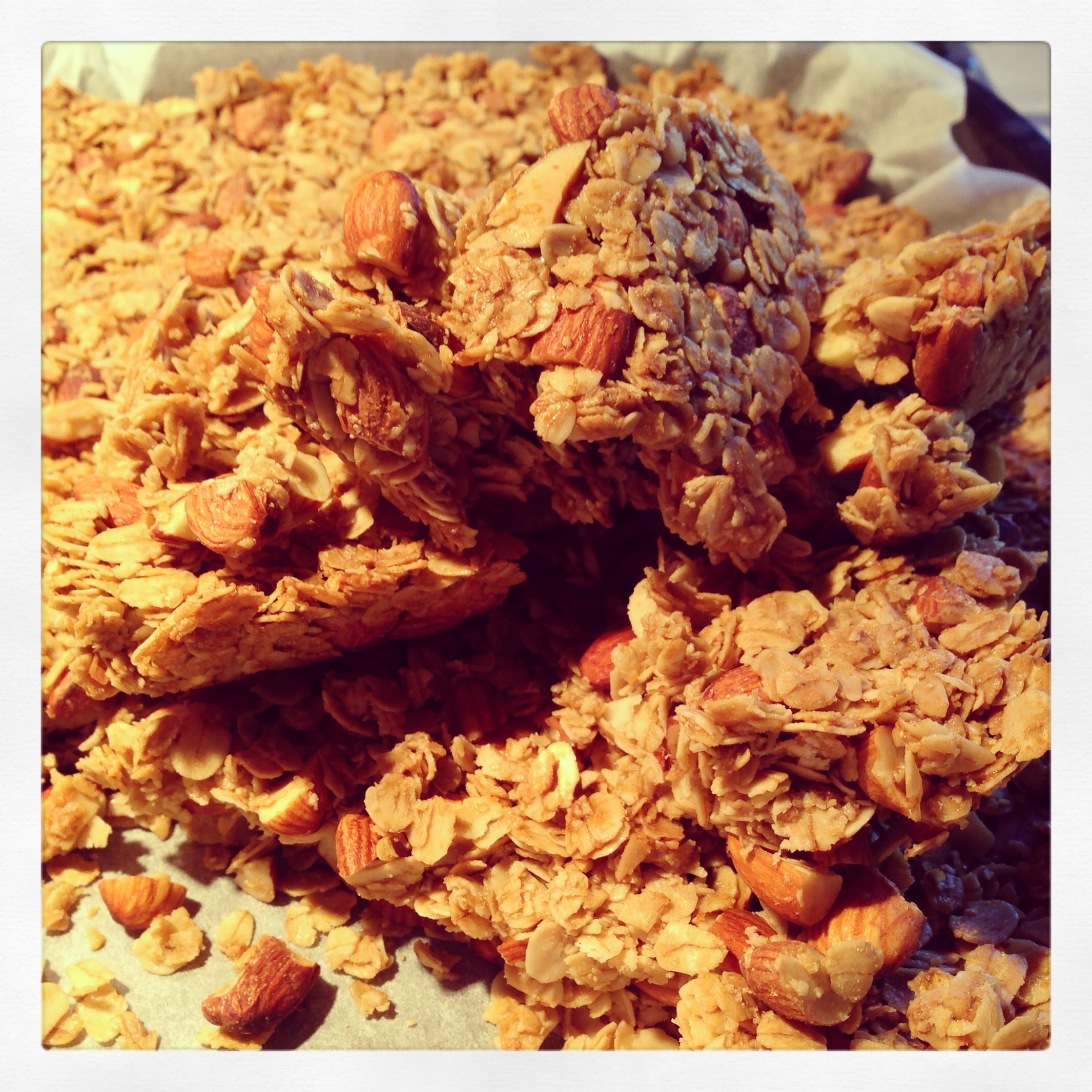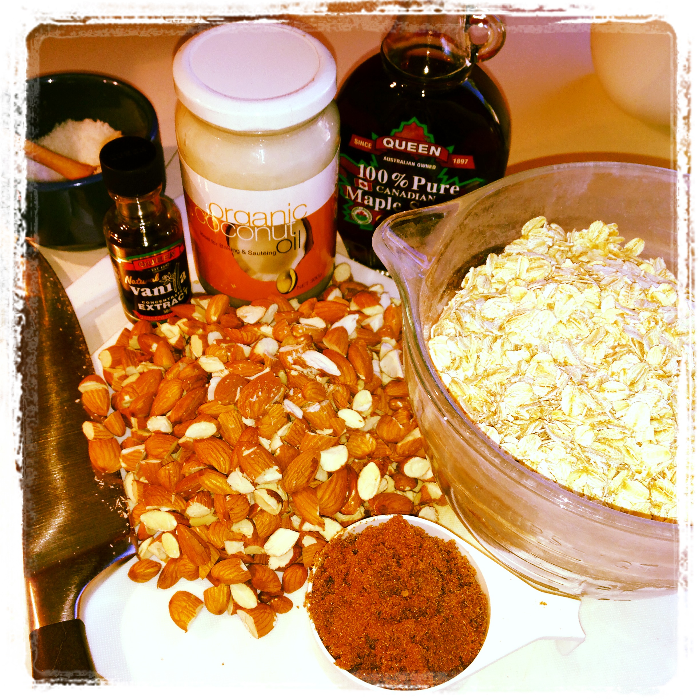 - In a large bowl thoroughly mix syrup, sugar, vanilla and salt. Add in oil and mix well. Mix in almonds and oats until all is well coated.
