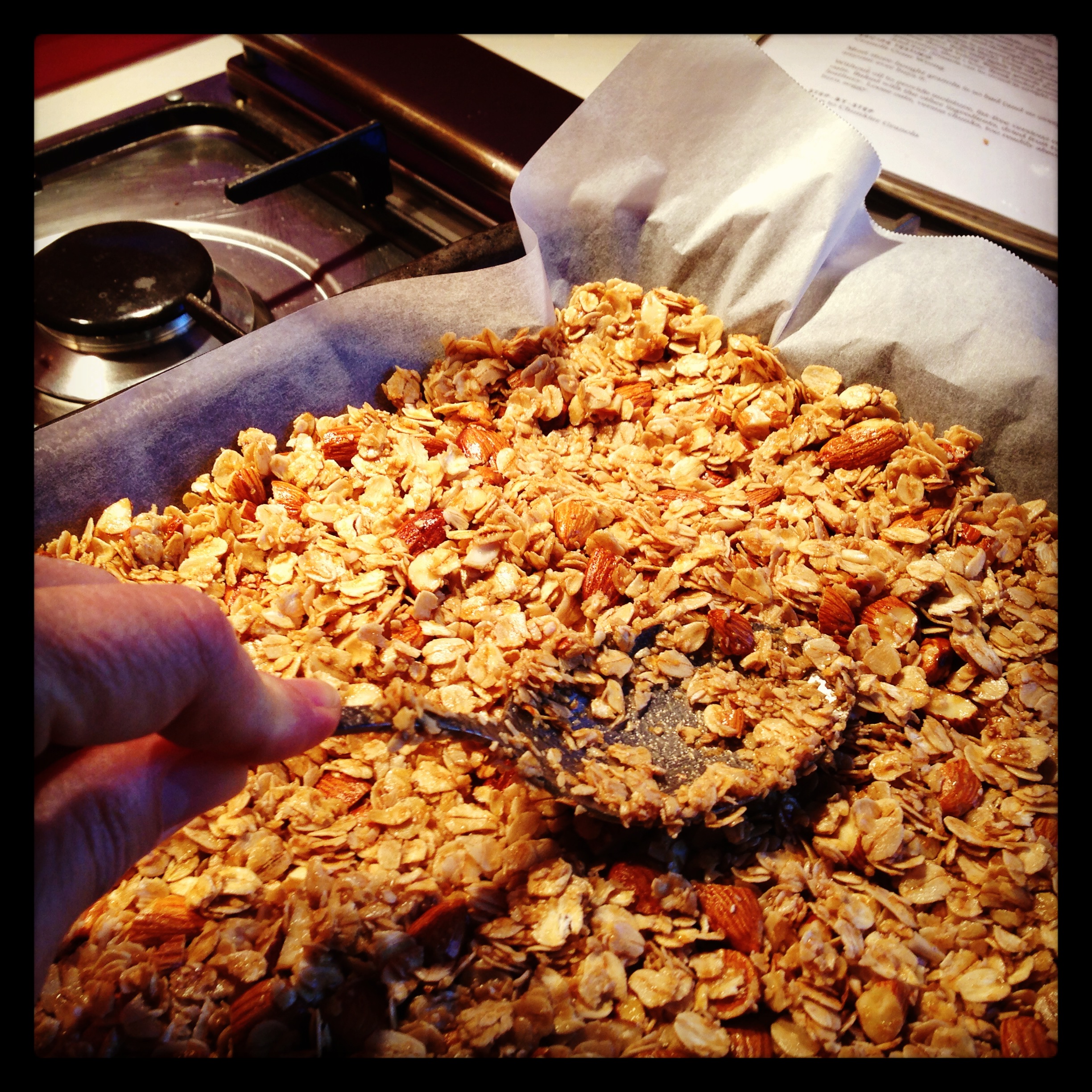 Transfer mixture into prepared baking pan and spread across evenly. With the back of the spoon press the mixture down into the pan. Unlike other toasted muesli recipes where you want the mixture to remain loose, this one should form one huge, toasted muesli ‘cookie’ when done.