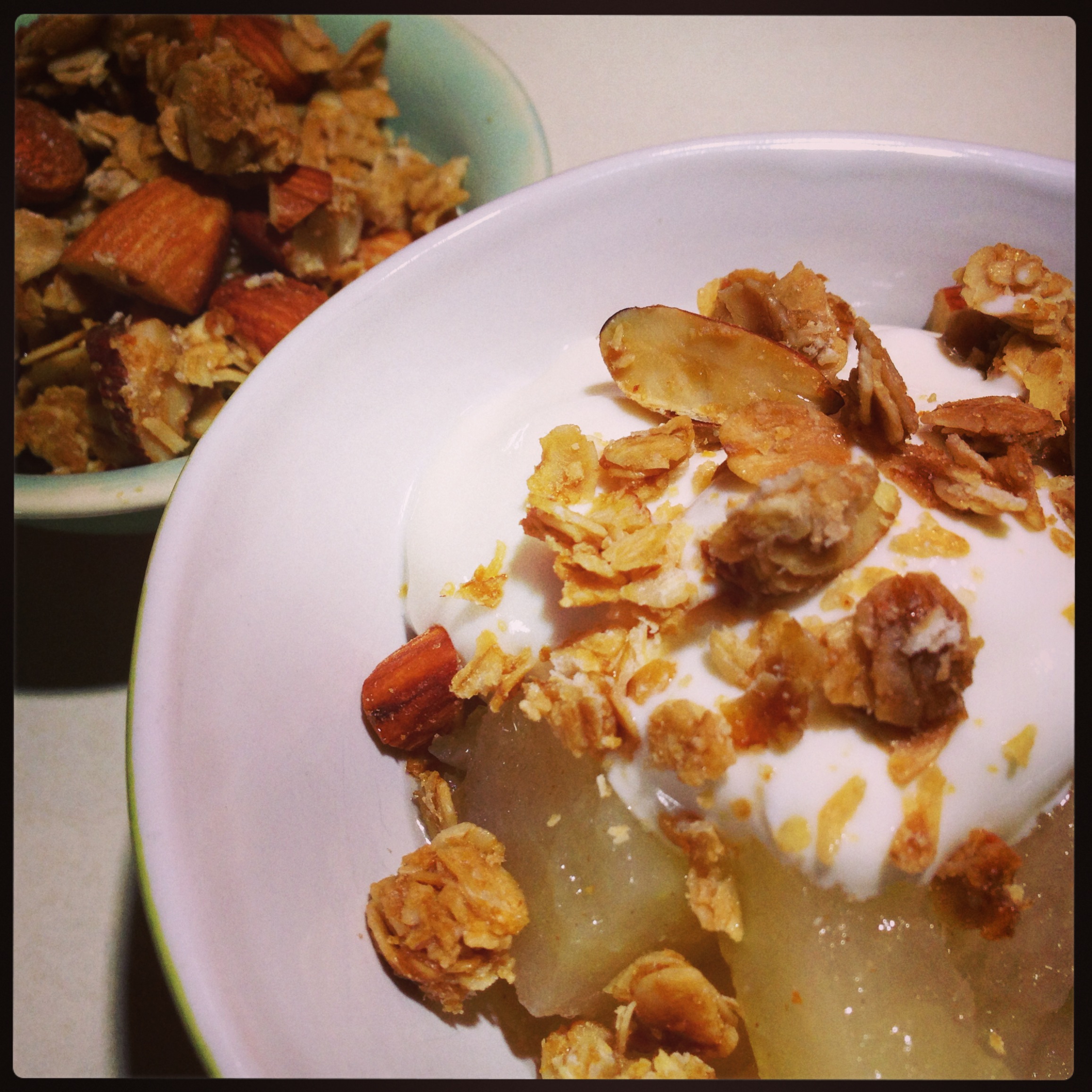 Originally toasted muesli (granola) was meant as a breakfast cereal, and this is delicious in that role, but you’ll want to add whatever fruit you like to it in this case. As I am gluten intolerant and fructose intolerant, I prefer to use it as a ‘topping’ or as a small snack. (the jury is still out on eating oats if you are gluten intolerant as it is easily contaminated by wheat) Below is one of my faves… homemade cooked granny smith apples topped with the muesli and a dollop of my favourite plain yogurt. As good as the best apple crumble… in my humble opinion!!