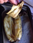 Bake for 40 minutes. When the eggplant comes out it will collapse. Slice the skin open and the liquid will gradually ooze out of the eggplant. Discard liquid and skin. Using a fork, shred the cooked insides, add a tiny, tiny amount of finely grated garlic, a pinch of salt and itโs ready to serve, or will keep in the fridge for a few days.
