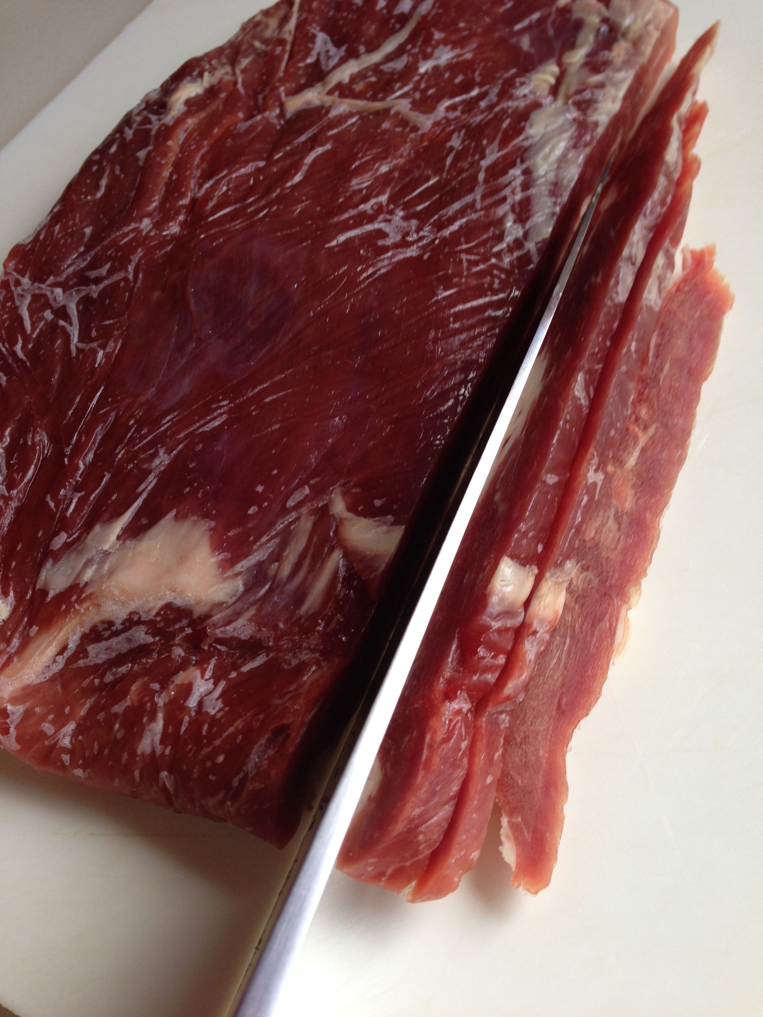 1.) 1kg (2 lbs) grass-fed beef flank steak (skirt steak in Australia). For ease of slicing, partially freeze the meat. Wrap each steak, one layer thick, in cling film and place in a flat position in the freezer for about 2.5 hours. It will seem rather solid on the edge but the middle will still be slightly soft and it will thaw a bit as you cut. Slice in 1/8 inch (3mm) thick pieces WITH the grain of the meat. Slice pieces as evenly as possible so they dry evenly.