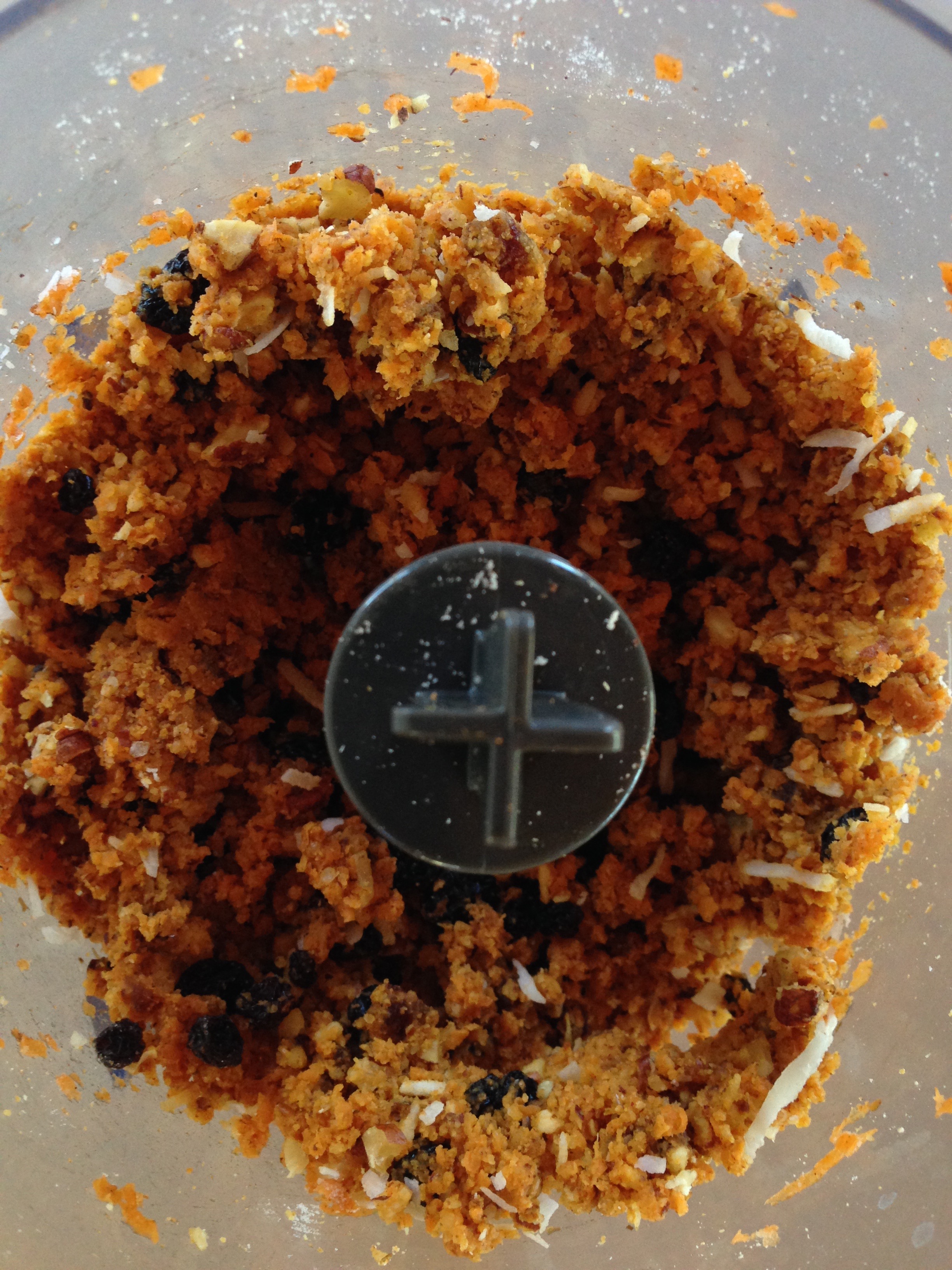Roll carrot mixture one at a time into walnut sized balls and roll in the topping mixture. You should end up with 8 or 9 bites. Put them into a covered dish in the fridge for half an hour or so to ‘set’.