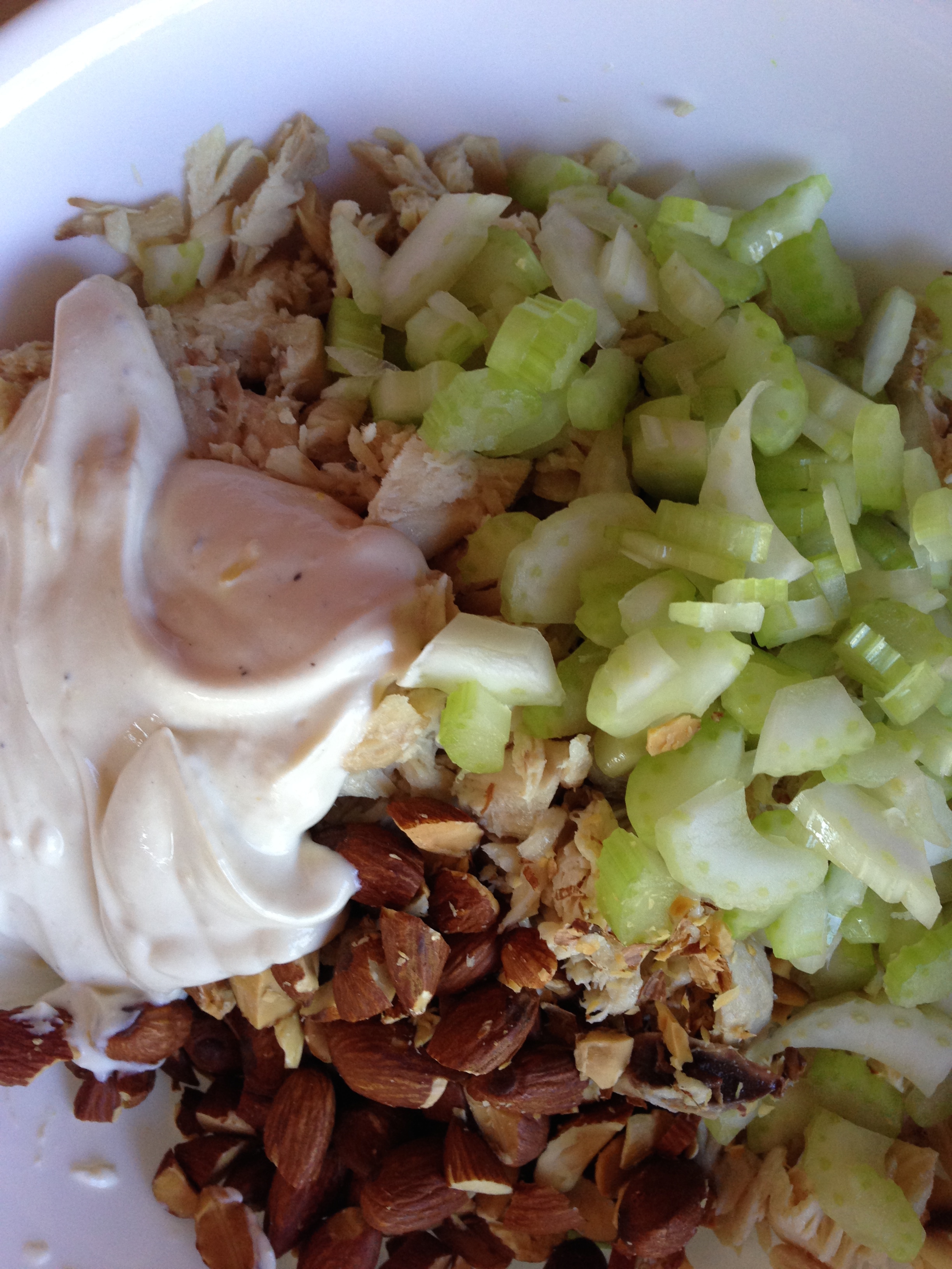 Prepare, and mix together your greens. In a separate bowl, combine chicken pieces, celery, almonds and ½ C of the dressing. Stir together thoroughly. Taste for salt and also to see if you need the rest of the dressing mixture. Add the currants, if using. Mix through.
