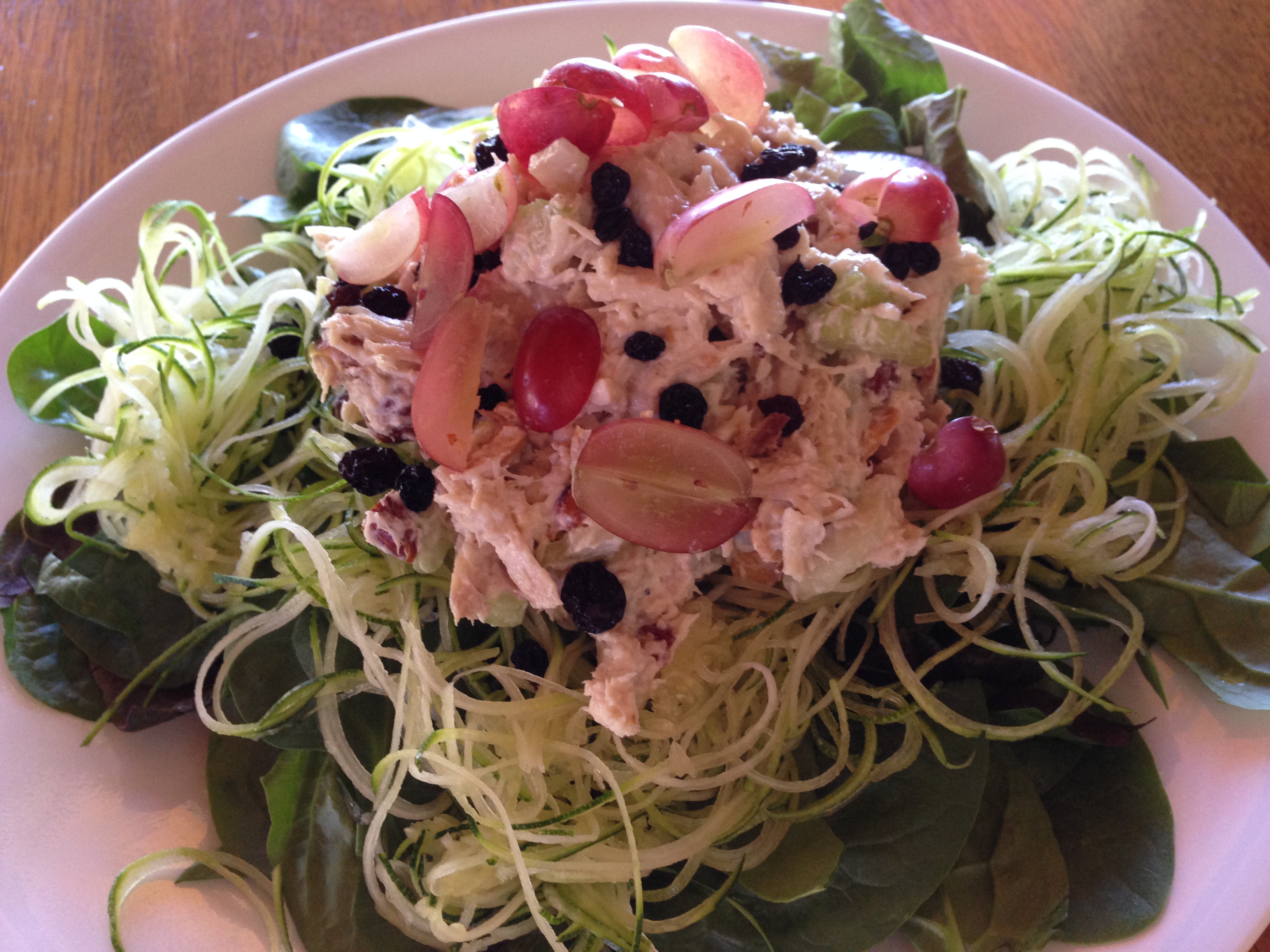 Bed of preferred greens (I use baby spinach leaves, romaine lettuce and raw, spiral cut zucchini)