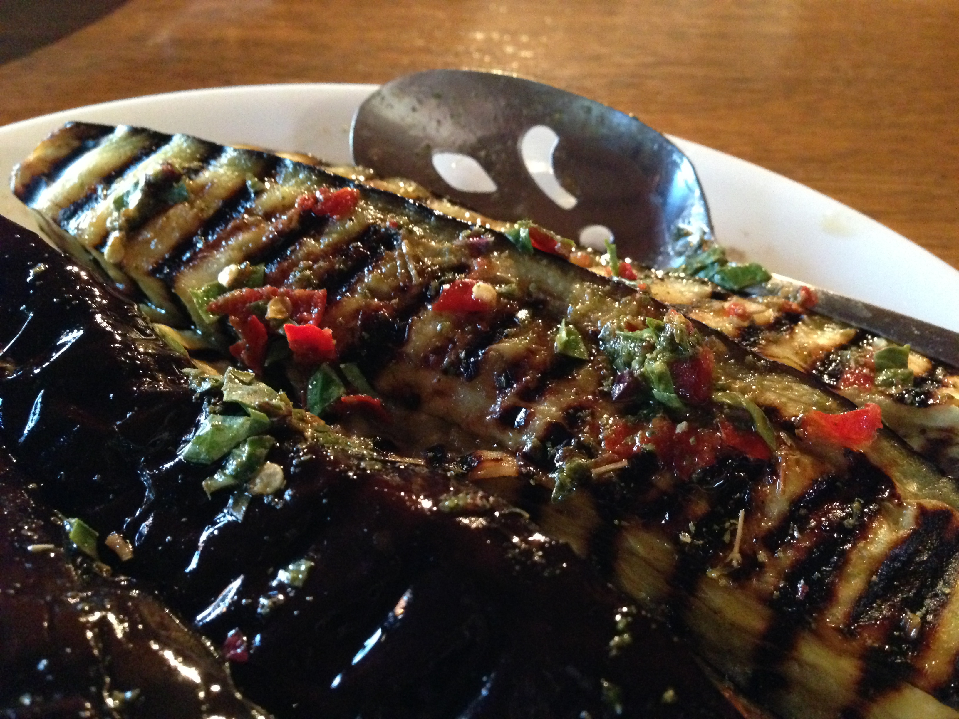 Dressing the eggplant strips while they’re still warm allows them to absorb the maximum amount of flavour.