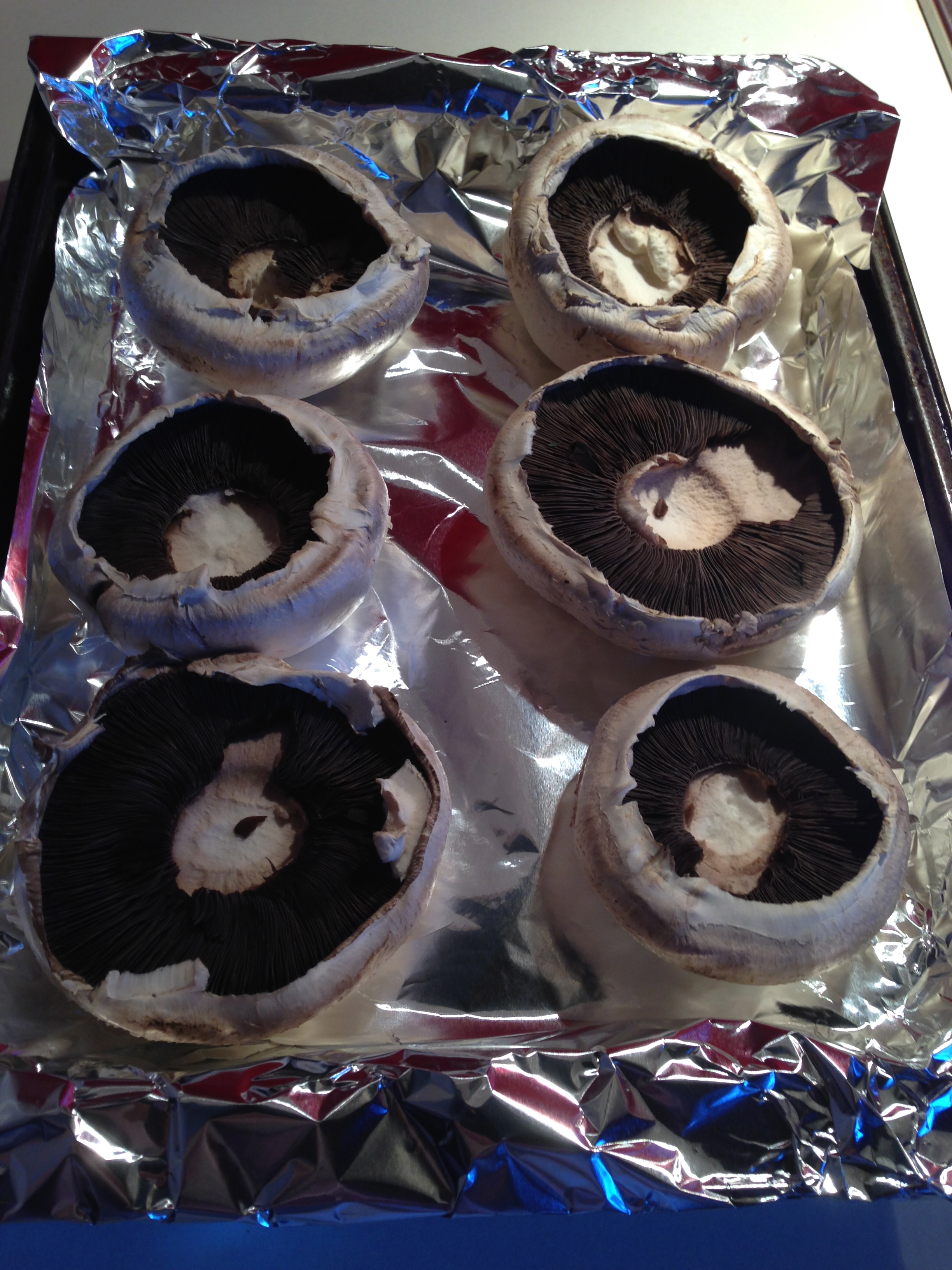 Line a baking tray with foil or baking paper. Remove stems from mushrooms and discard* and clean the caps from any debris. Lay the mushrooms under-side up in the baking tray.